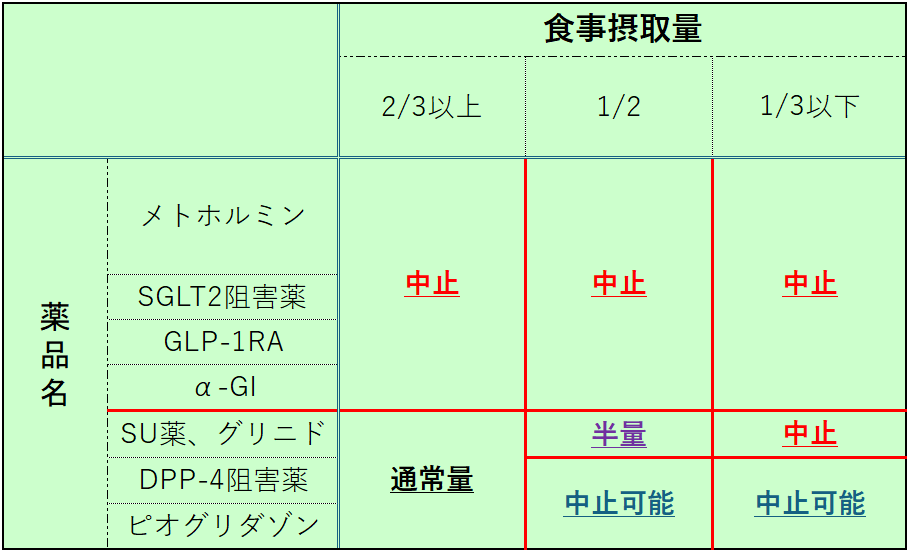 シックデイ時には、糖尿病治療薬の調整が必要になります。お薬の種類ごとに対応は変わりますが、中止や減量については医師の指示に従う事が原則となります。